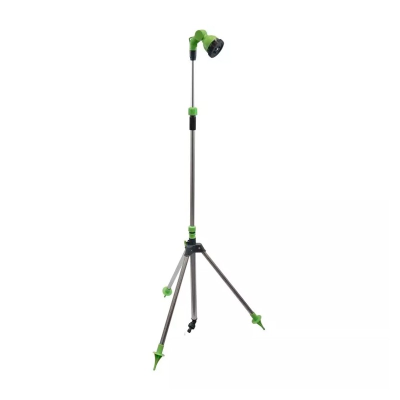 Ducha portátil de jardín con base de trípode.