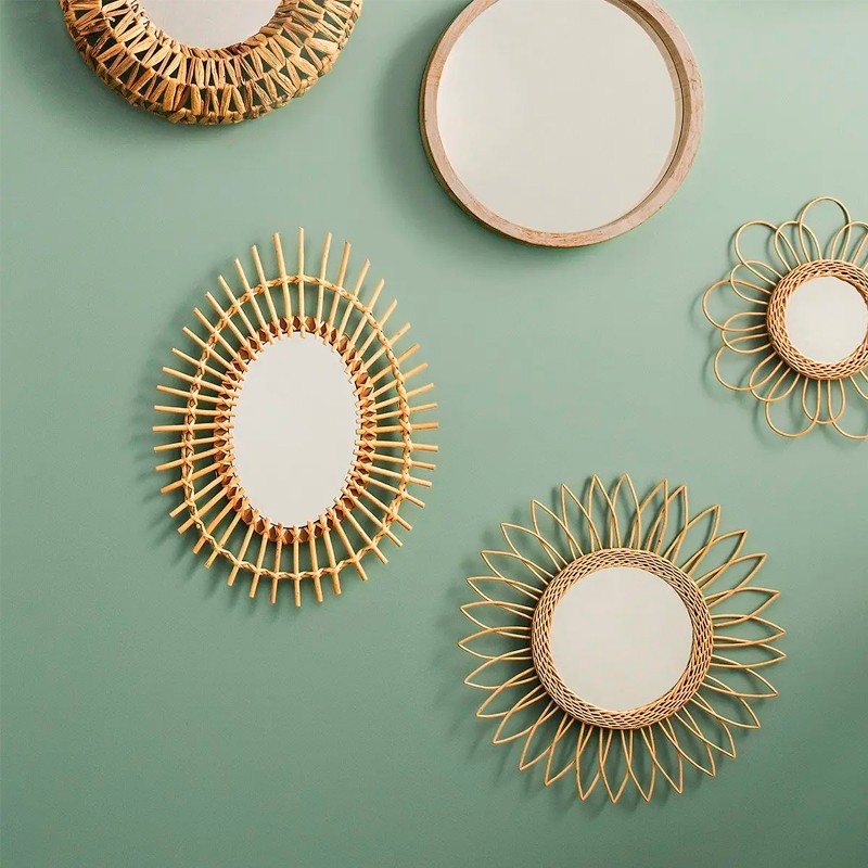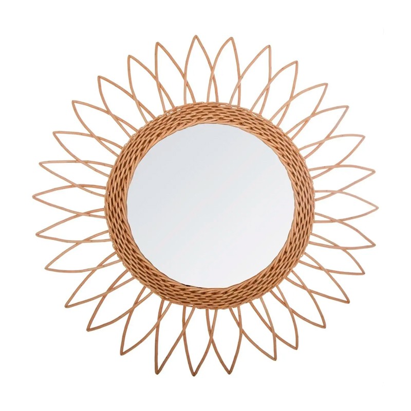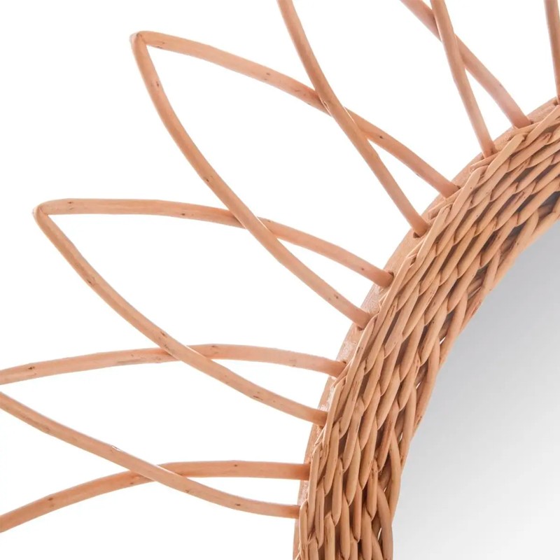 Espejo de pared con forma de sol hecho con una estructura de ratán.
